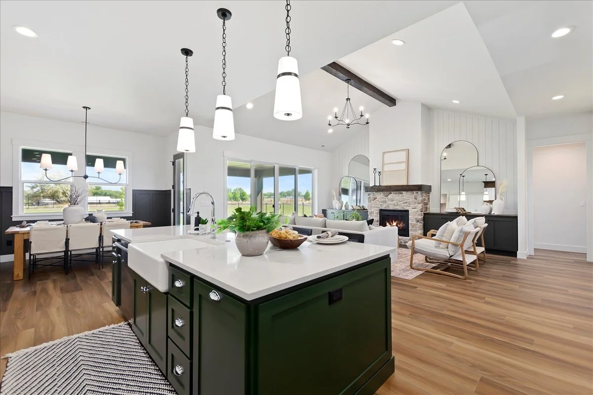 Welcome to the ‘Hamilton’ by B&B Custom Homes. The exterior features a dark color scheme with rich stained timber accents, black windows, rustic stone & drive through RV Bay. The interior features elegant and classic trim accents throughout, rich colored cabinetry and accent walls, traditional themed electrical fixtures, vaulted ceiling in living room with symmetrical entertainment center, rustic stone on front of the fireplace & elevated designer finishes throughout.